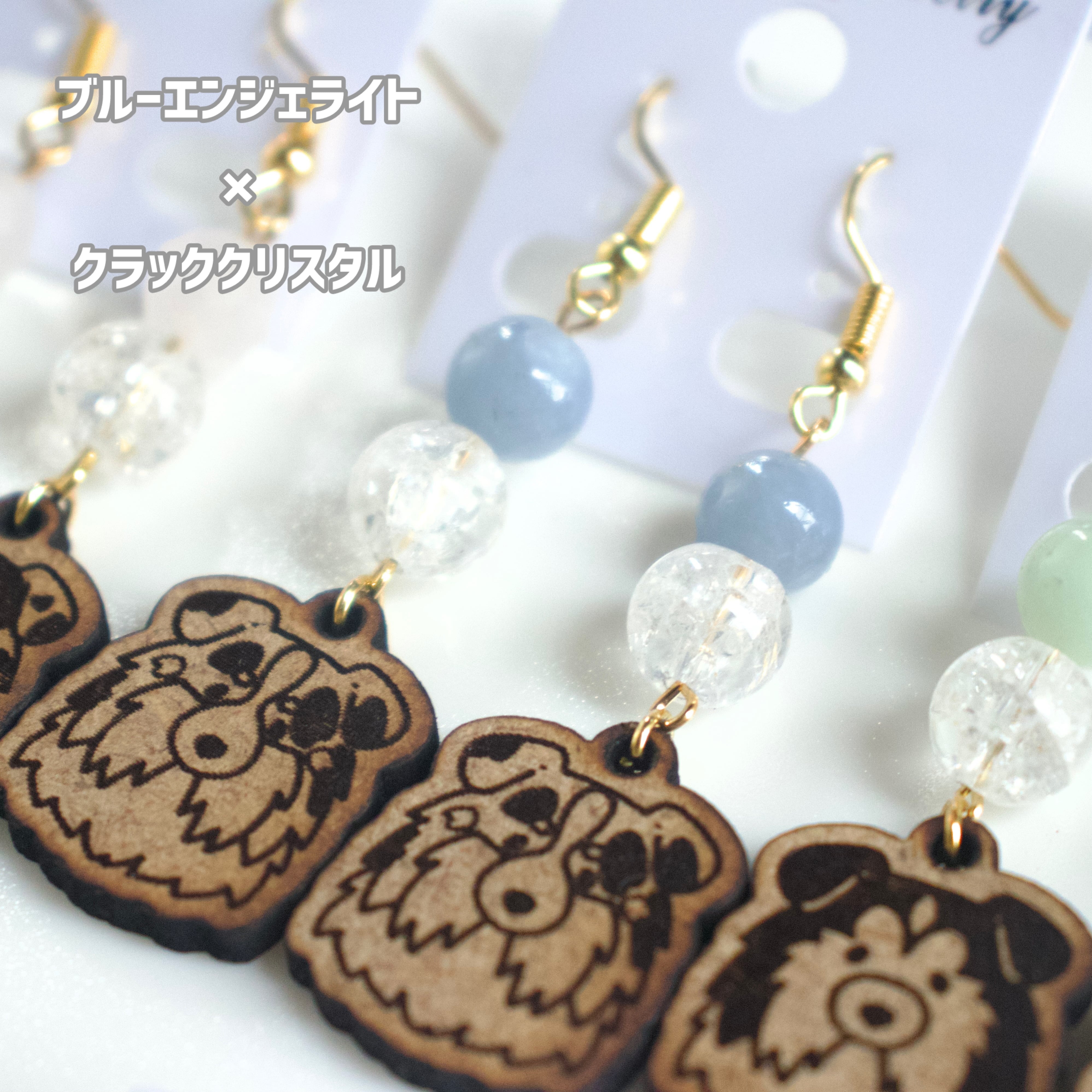 この特別なピアスは、博愛と平和の象徴であるブルーエンジェライトを使い、シェルティの可愛らしさを表現したデザインです。木材(MDF)と組み合わせることで、優しさ溢れる風合いを実現しました。