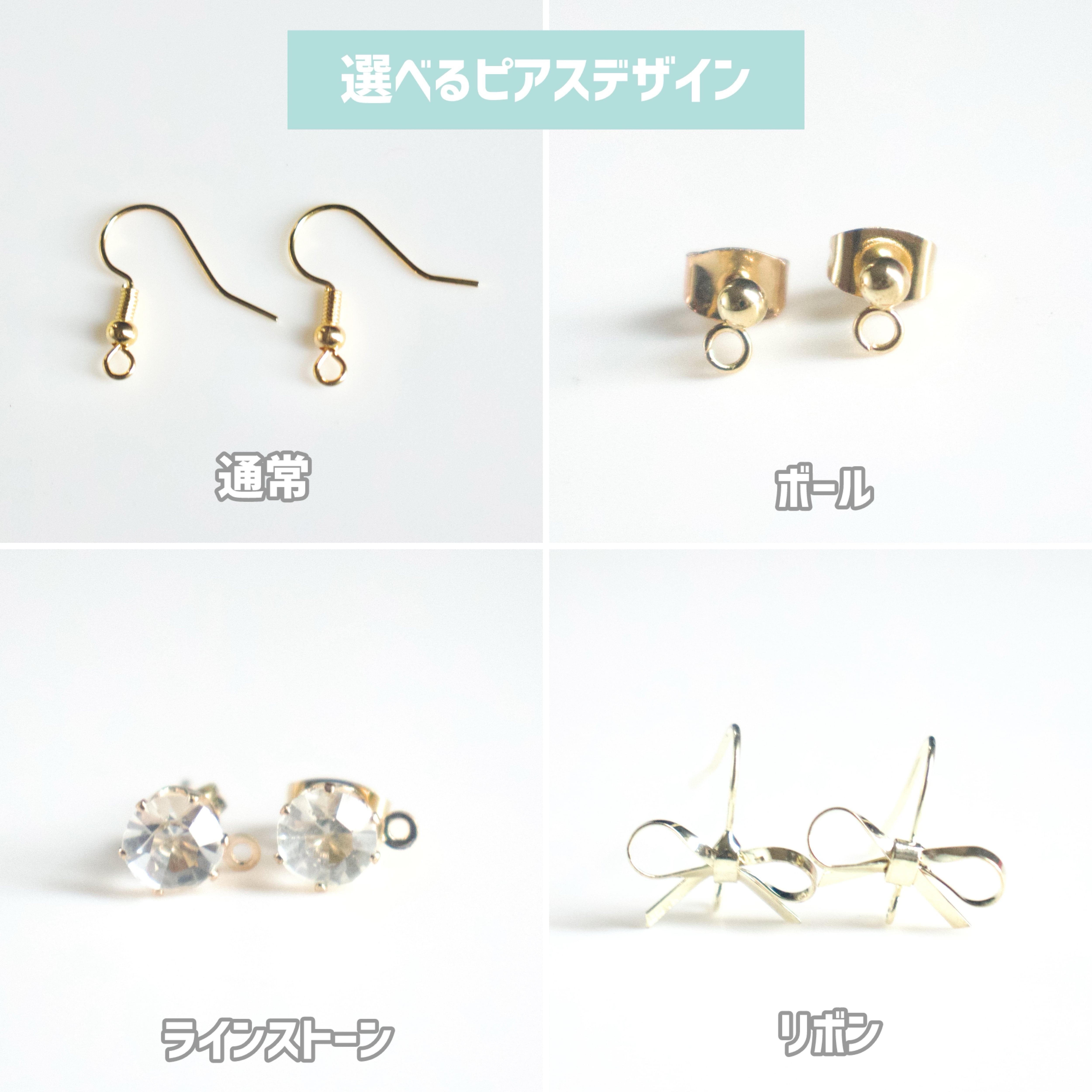 ピアス素材/天然石、真鍮(フック、リボン)、サージカルステンレス(ボール)、ステンレス(ラインストーン)、MDF(チャーム部分)