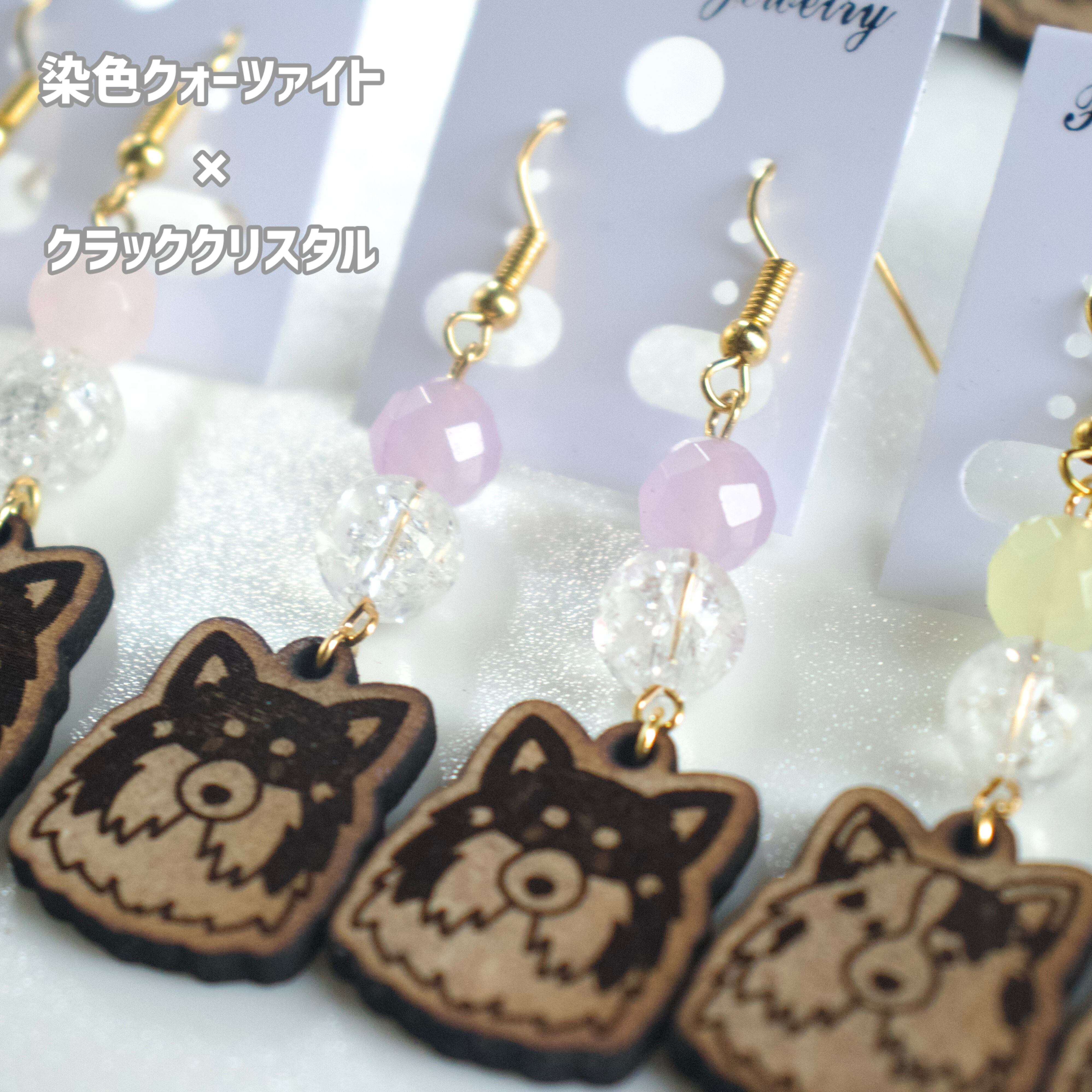 この特別なピアスは、調和と親しみの象徴であるクォーツァイト(染色)を使い、シェルティの可愛らしさを表現したデザインです。木材(MDF)と組み合わせることで、優しさ溢れる風合いを実現しました。