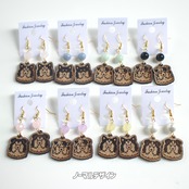 ピアス素材/天然石、真鍮(フック、リボン)、サージカルステンレス(ボール)、ステンレス(ラインストーン)、MDF(チャーム部分)